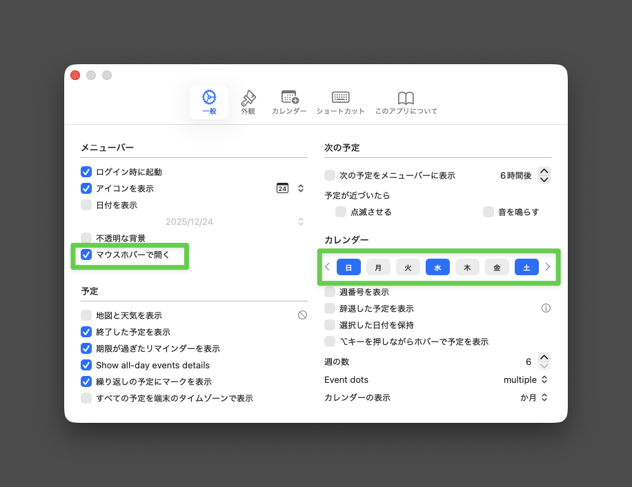 設定を変更することで、メニューバーにホバーするだけでカレンダーが表示されるようにもできます。