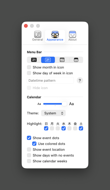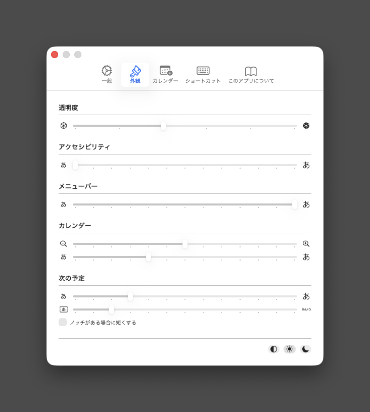 メニューバーのアイコンのサイズや、カレンダーの文字サイズ、予定の文字サイズなどを細かく設定することができます。