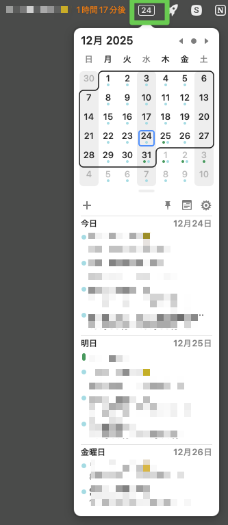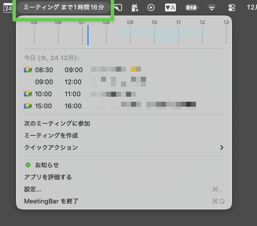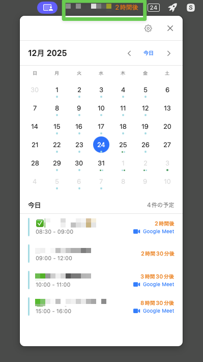 メニューバーには「次の予定のタイトル」と「開始までの残り時間」が表示されます。