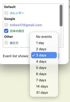 設定の「Event list shows」から、表示する予定の期間を変更できます。