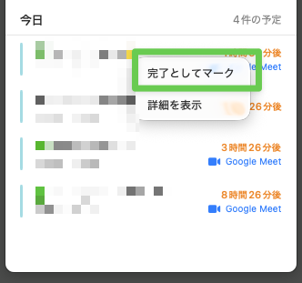 予定を右クリックすることで、完了マークをつけれられたり、詳細の確認もできます。