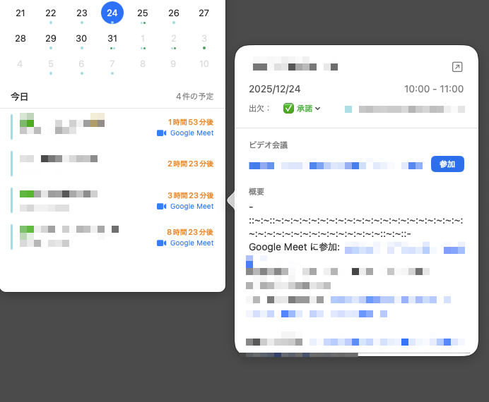 GoogleMeetなどのリンクがある場合、その文字をクリックすることで会議に参加できますが、後述する全画面の通知機能という便利機能のおかげで使うことは基本的にありません。