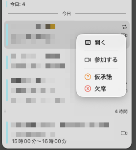 予定を右クリックすると、標準のカレンダーアプリを開いたり、会議に参加することができます。